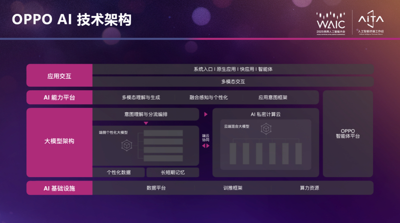 WAIC 2025上,OPPO对AI 战略进行了更详细的诠释。OPPO智能助理部总经理、小布助手负责人万玉龙发表了题为《大模型时代智能终端的AI进化论》的演讲,OPPO 秉持 “高效 & 专属” 的 AI 价值主张,聚焦 “1+3” 核心场景(“1” 为系统级智慧体验,“3” 为影像、生产力、文娱场景)。