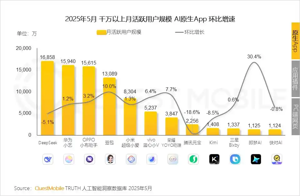 在回归人本价值的驱动下,用户最直观的感受就是AI更加好用,也更愿意去用。根据调研机构 QuestMobile 的数据显示,截至 5 月份,在 AI 月活跃 APP 榜单中,DeepSeek、华为小艺、OPPO 小布助手、豆包、小米超级小爱占据前五席位,月活跃用户规模依次为 1.69 亿、1.59 亿、1.56 亿、1.31 亿和 0.83 亿。