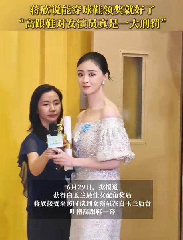 白玉兰后台采访时,蒋欣就直接对着记者说:“要是能穿鞋领奖就好了,高跟鞋对女演员真的是一大刑罚”。