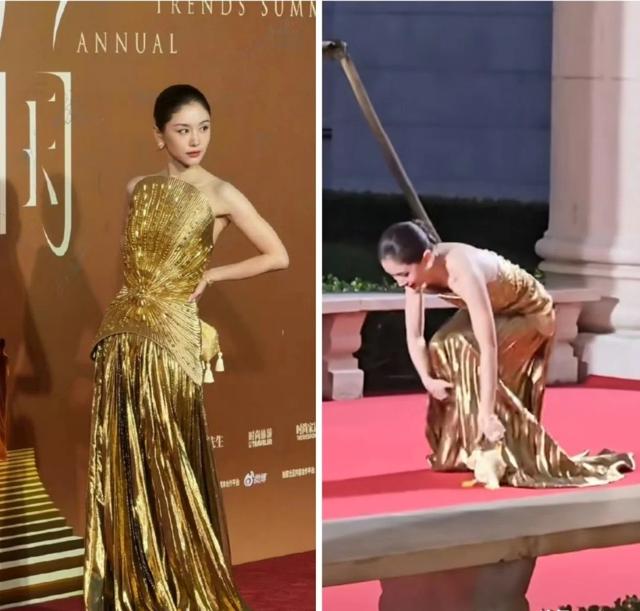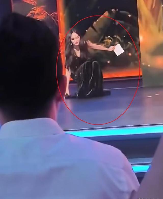 杨幂这次内场活动穿着拖地长裙,加上十几厘米高的高跟鞋,手中拿着话筒和题词卡,她就只能用一只手拖着裙摆走路,由于裙摆太长,她一时不及就被绊倒了。