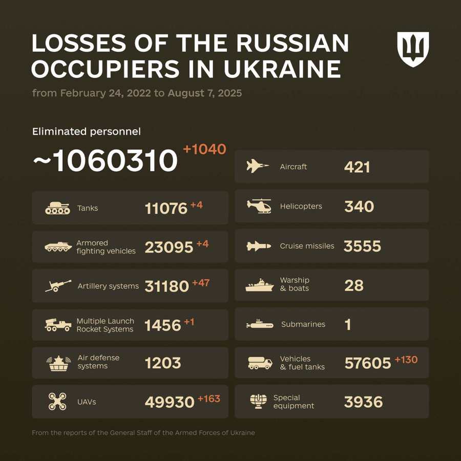 乌总参公布的昨日战果,杀敌(毙+伤)1040人,俄军总伤亡超过106万了。