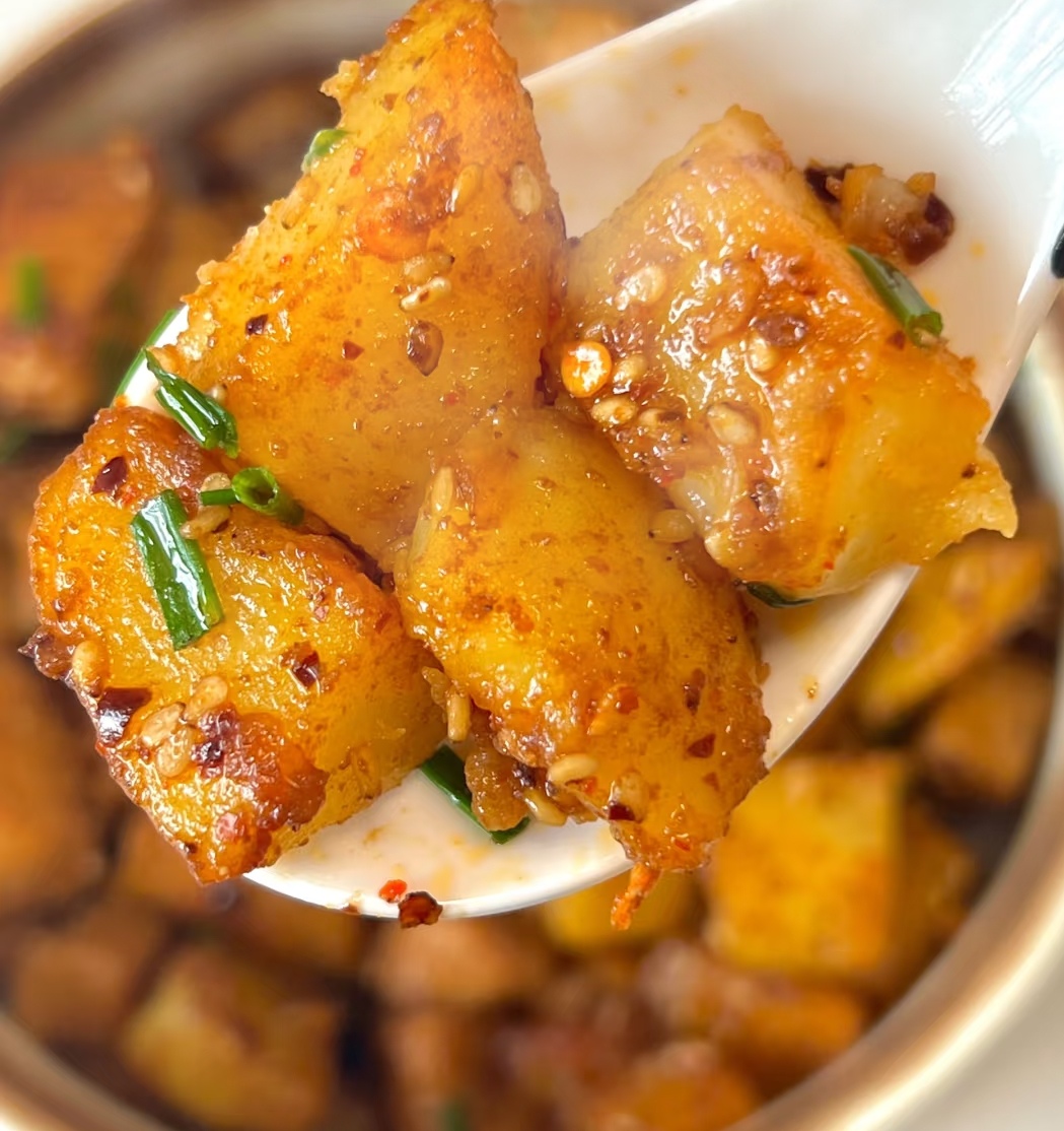 我第一次做这道菜,是大学毕业那年的“搬家趴”。新租的屋子没网、没沙发,只有一口不粘锅和从老家背来的小孜然。四个人围着纸箱当餐桌,抢着用筷子戳土豆,烫得直跳脚,却异口同声:“怎么有烧烤摊的味道?”那一刻,突然懂了:所谓“人间烟火”,就是把你最熟悉的味道,用最简单的办法,复刻到眼前。后来出差、加班、隔离……只要冰箱里有这三样,我就能在 15 分钟内回到那个纸箱版“小烧烤摊”。