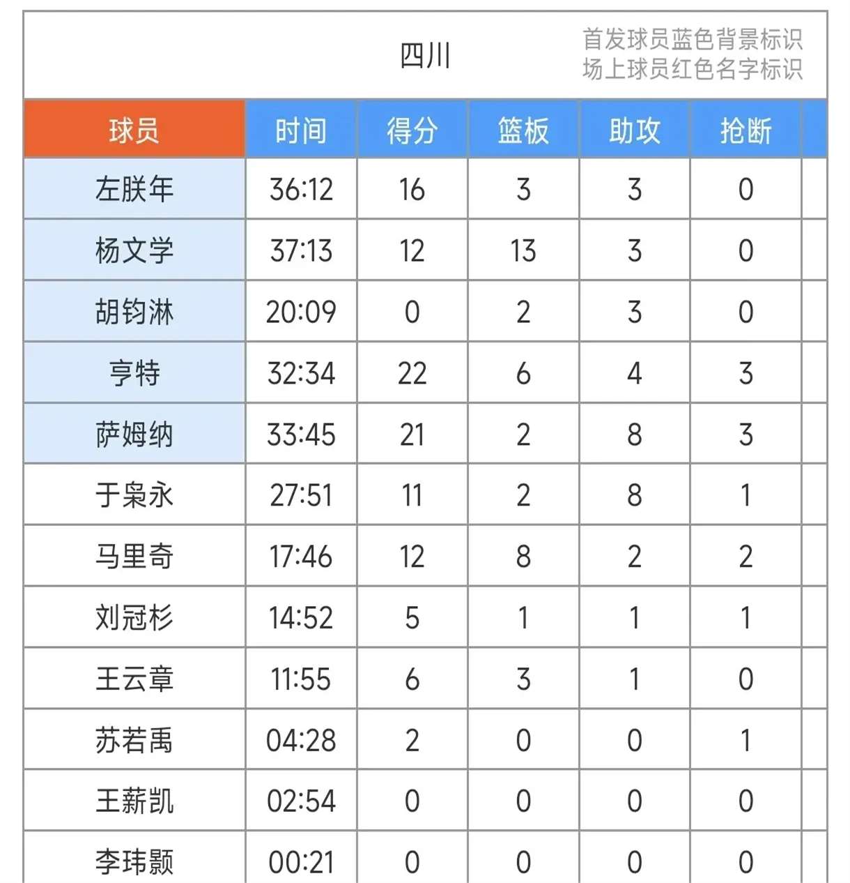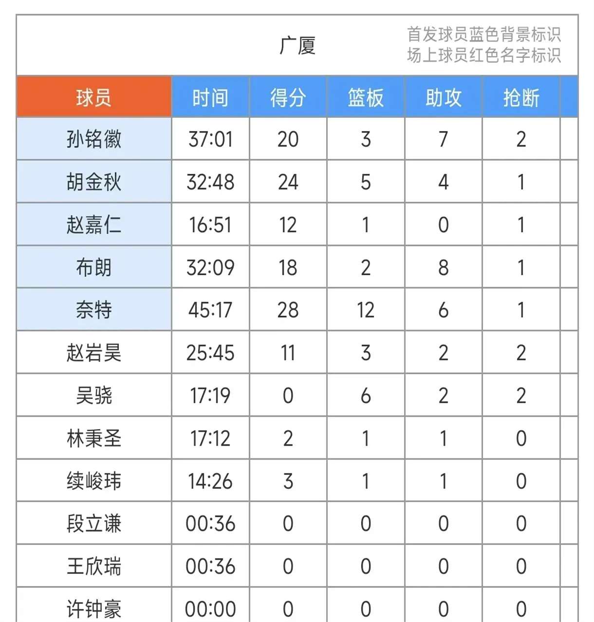 广厦队方面,孙铭徽得到20分3篮板7助攻,胡金秋贡献24分5篮板4助攻,赵嘉仁得到12分,布朗贡献18分8助攻,奈特则有28分12篮板6助攻的出色表现。四川队方面,左朕年得到16分3篮板,杨文学贡献12分13篮板3助攻,亨特得到22分6篮板3抢断,萨姆纳贡献21分8助攻3抢断。