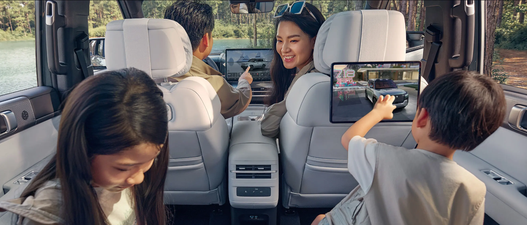 全系标配前双叉臂后五连杆底盘、搭载了五感座舱、通风加热、天神之眼智驾、TSC爆胎稳定系统、电吸尾门、26英寸HUD及“小书包”备胎箱,配置诚意十足。内饰搭载迪声音乐座舱在听觉方面配备至高20个扬声器,嗅觉方面定制了3款车载香氛,触觉方面采用真皮“舒芙蕾”座椅,味觉上配备智能冷暖冰箱,视觉上实现了七屏联动交互。“比如坐在后排的家人用Pad搜索了餐厅路线,就能一键同步到前排的中控屏上,直接导航,真正实现了跨屏无缝衔接,营造科技豪华氛围。”