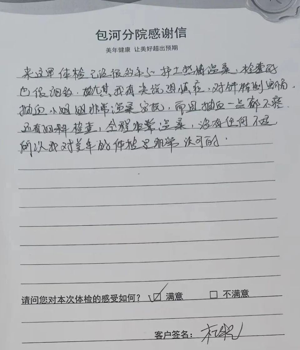 更让她感动的是分院对长辈的特别照护:“工作人员对老人有求必应,这种不是亲人胜似亲人的耐心,让我们做子女的无比安心。”从朋友推荐到亲身验证,美年用细节赢得又一个家庭的信赖。
