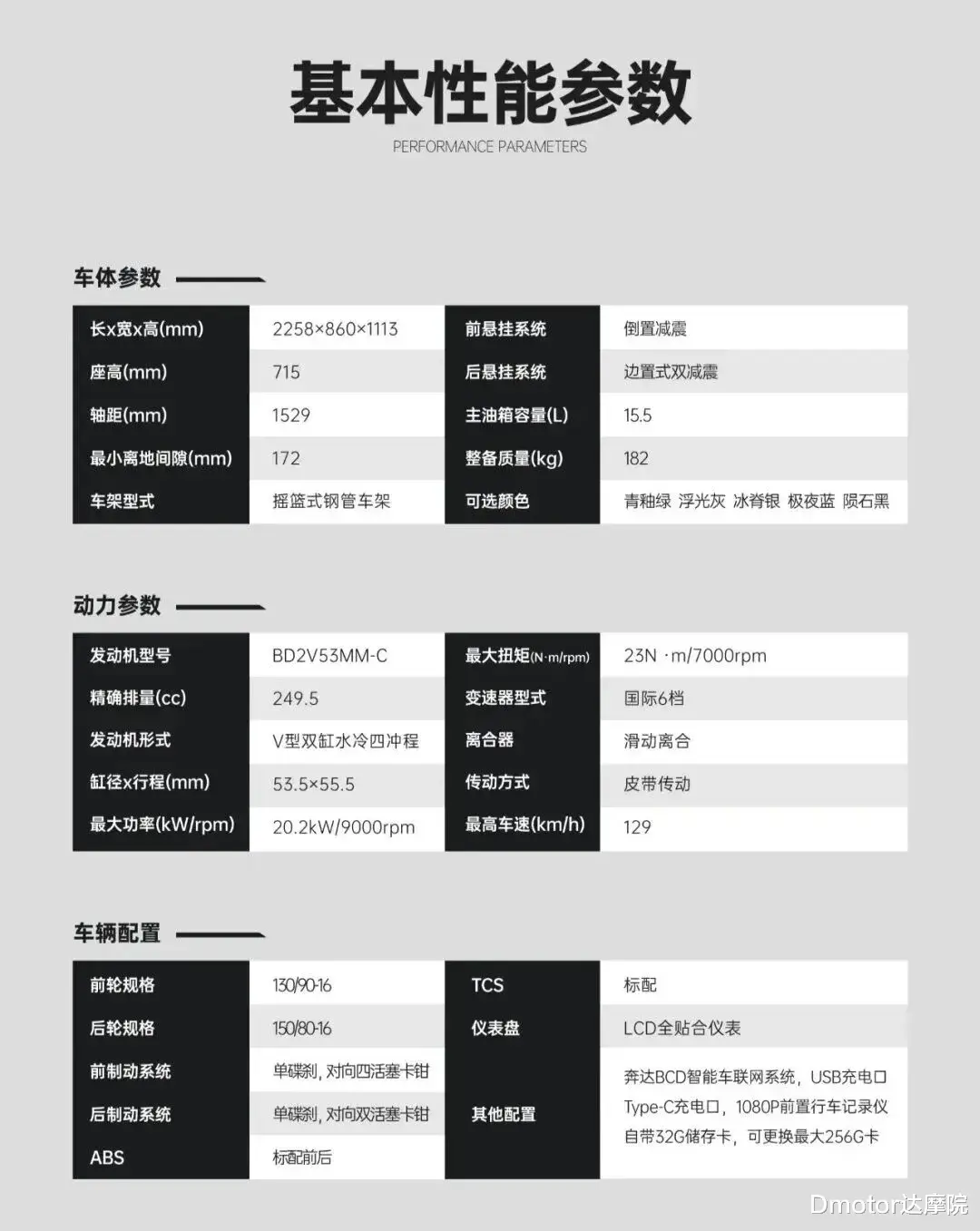 26款灰石250搭载的是一款奔达“新”250cc级V型双缸发动机,在9000转输出最大功率20kW(约27.2匹马力),最大扭矩23Nm。
