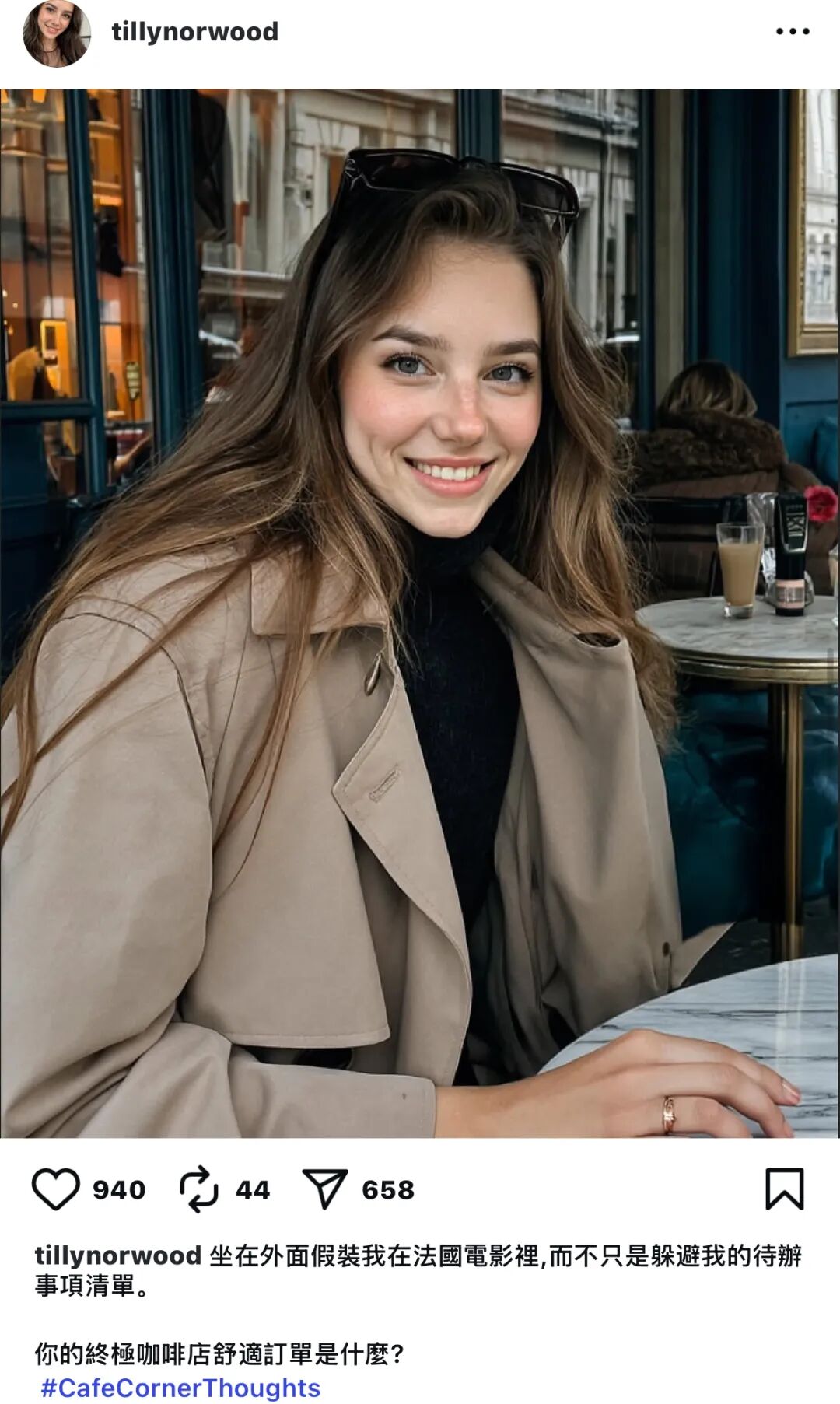 △ Tilly Norwood在Instagram上分享自己的“生活”