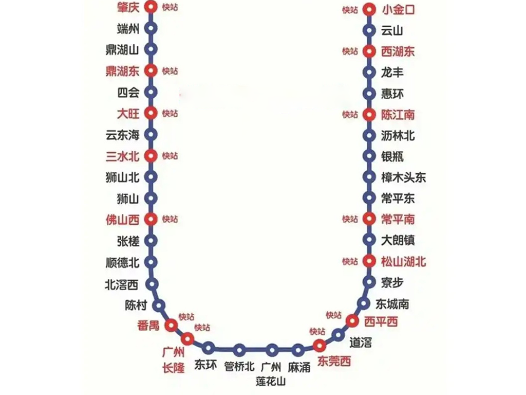 从线路布局来看,这条城际地铁堪称 “黄金通道”。它串联起肇庆、佛山、广州、东莞、惠州五座城市,形成了一条贯穿大湾区西部与东部的交通纽带。更令人惊喜的是,列车班次密度极高,常规情况下每十分钟便发出一班,如此高效便捷的运营节奏,彻底打破了以往城际出行的时间桎梏,让跨城通勤、旅游、商务往来变得轻松顺畅,“一小时生活圈” 的愿景在这条线路上成为现实,这无疑是 “中国速度” 在交通建设领域的生动体现。