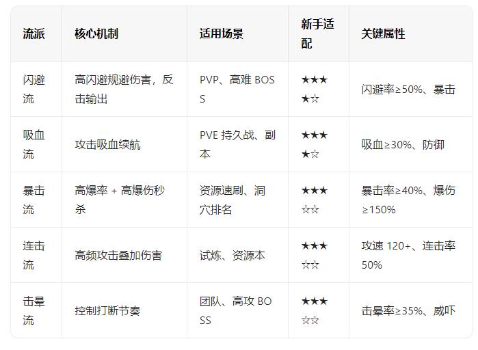 闪避流→暴击流→击晕流→其他流派,PVP 可针对性调整属性(如打闪避流堆韧性)。