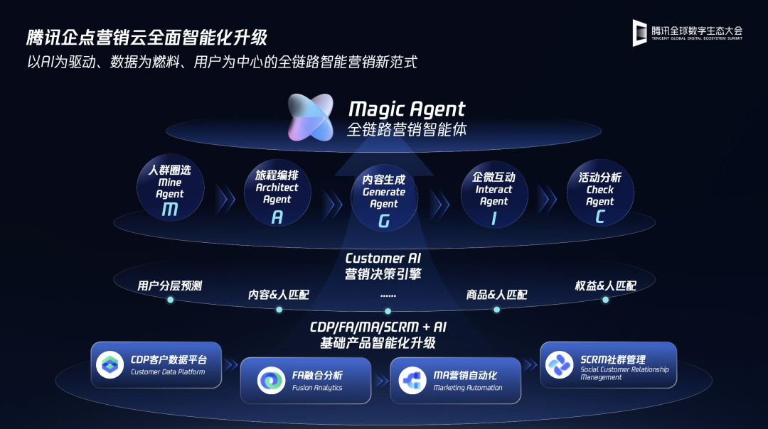 不论是传统包括CDP、MA、FA等产品的AI化升级,还是Customer AI,抑或者是Magic Agent全链路营销智能体,更可以理解为,这些被腾讯企点营销云给出的答卷都是从真实的实践中长出来的产品和AI思想,这其中不仅有足够先进且适配零售行业的模型算法、知识库等技术理念,更被封装的还有一个个真实人货场体系的产业AI know-how。