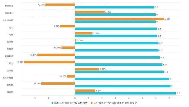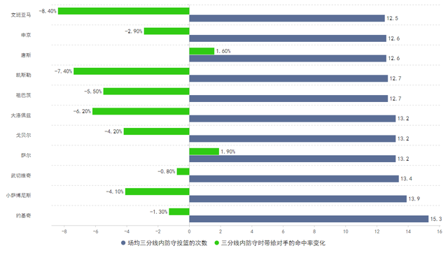 在整个三分线内他场均防守对手12.5次出手位于第11,降低对手命中率的幅度为防守次数最多的11人中的第1;