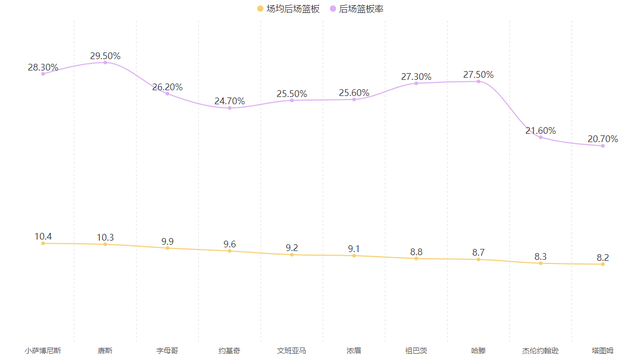 防守的第三个目标是获得防守篮板,防守成功后如果无法获得篮板那么这次防守就等于是失败的。文班亚马本赛季场均防守篮板为9.2个位于联盟第5,25.5%的防守篮板率在场均后场篮板最多的10人中位于第7,这意味着他的篮板能力也是联盟顶尖的水准。