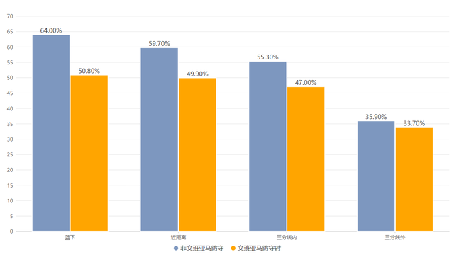 防守的第二个目标是降低对手命中率,文班亚马本赛季在篮下、近距离、三分线内与三分线外均令对手投出了比赛季平均更低的命中率,这意味着无论在哪个区域他都可以限制对手的投篮。
