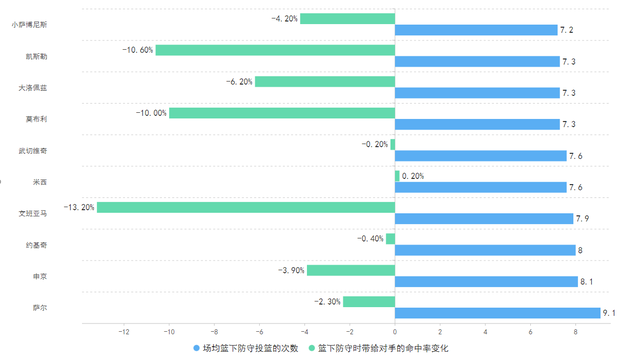 在10英尺内的近距离区域他场均防守对手9.1次出手位于联盟第八,降低对手命中率的幅度在近距离防守次数最多的10人中位于第1。