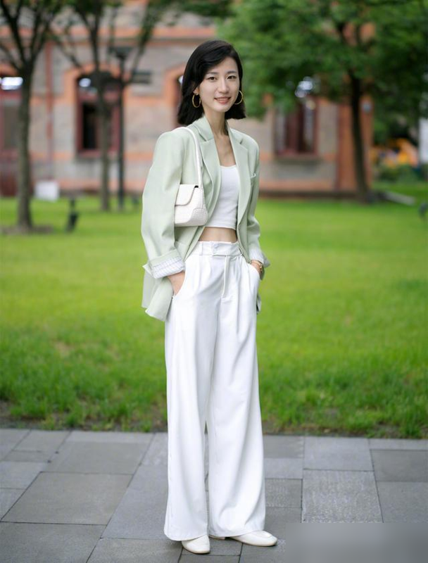 2. 裤装搭配:露肤+顺色是关键九分裤配小白鞋是“显高王炸”:裤脚刚好卡在脚踝上3cm,露出最细的脚踝部分,再搭双厚底小白鞋,腿长直接拉到“三七分”。如果想穿阔腿裤,选拖地款配基础款小白鞋,鞋子和裤脚的白色顺色,不仅不拖沓,还能营造“腿长过膝”的错觉。