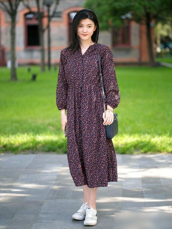 1. 裙装搭配:繁简结合更出片春天穿连衣裙,选小白鞋准没错。