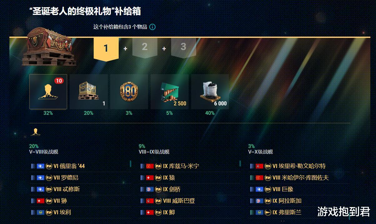 为了让玩家更容易拿到高级船和稀有船,今年圣诞活动还新增了“圣诞老人的终极礼物”补给箱,不仅高级船和稀有船的爆率更高,金币、高账时长、煤炭这类奖励的数量也更丰厚,不管是想扩充舰船数量,还是获取资源都很值得入手。