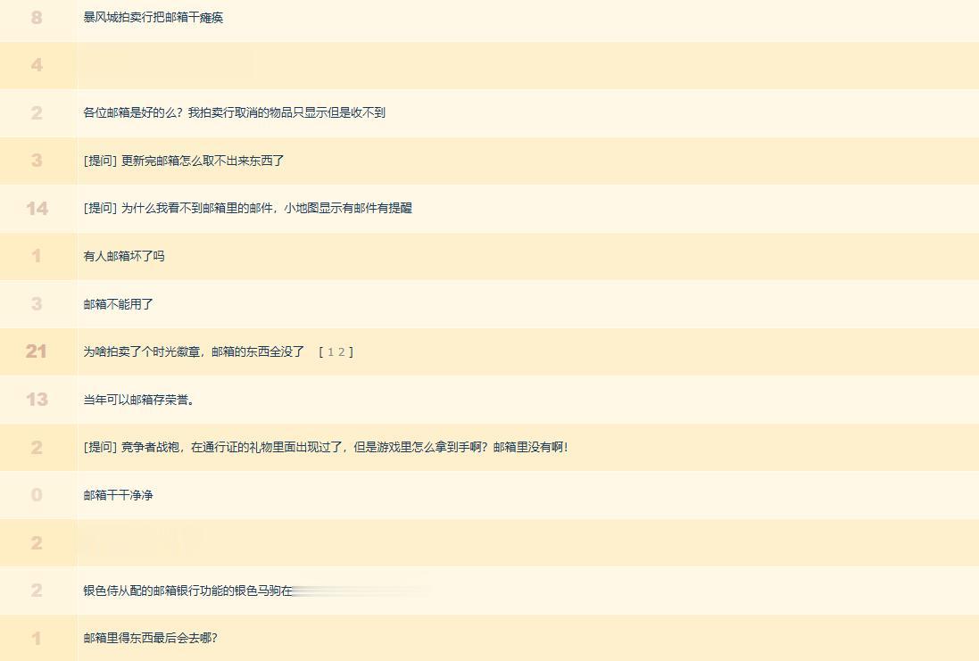 从开服以后,大量玩家就在论坛中反馈说邮箱出了问题,具体表现为在拍卖行中购买装备、卖出装备以及交易其他各种各样的材料,成交后正常来说应该会收到金币或者购买的材料。但是大量玩家发现邮箱中空空如也,然而拍卖行上的装备确实没了,自己支付的金币也没有了,后面才发现是邮箱系统出了问题,所以这段时间交易基本处于停滞状态。