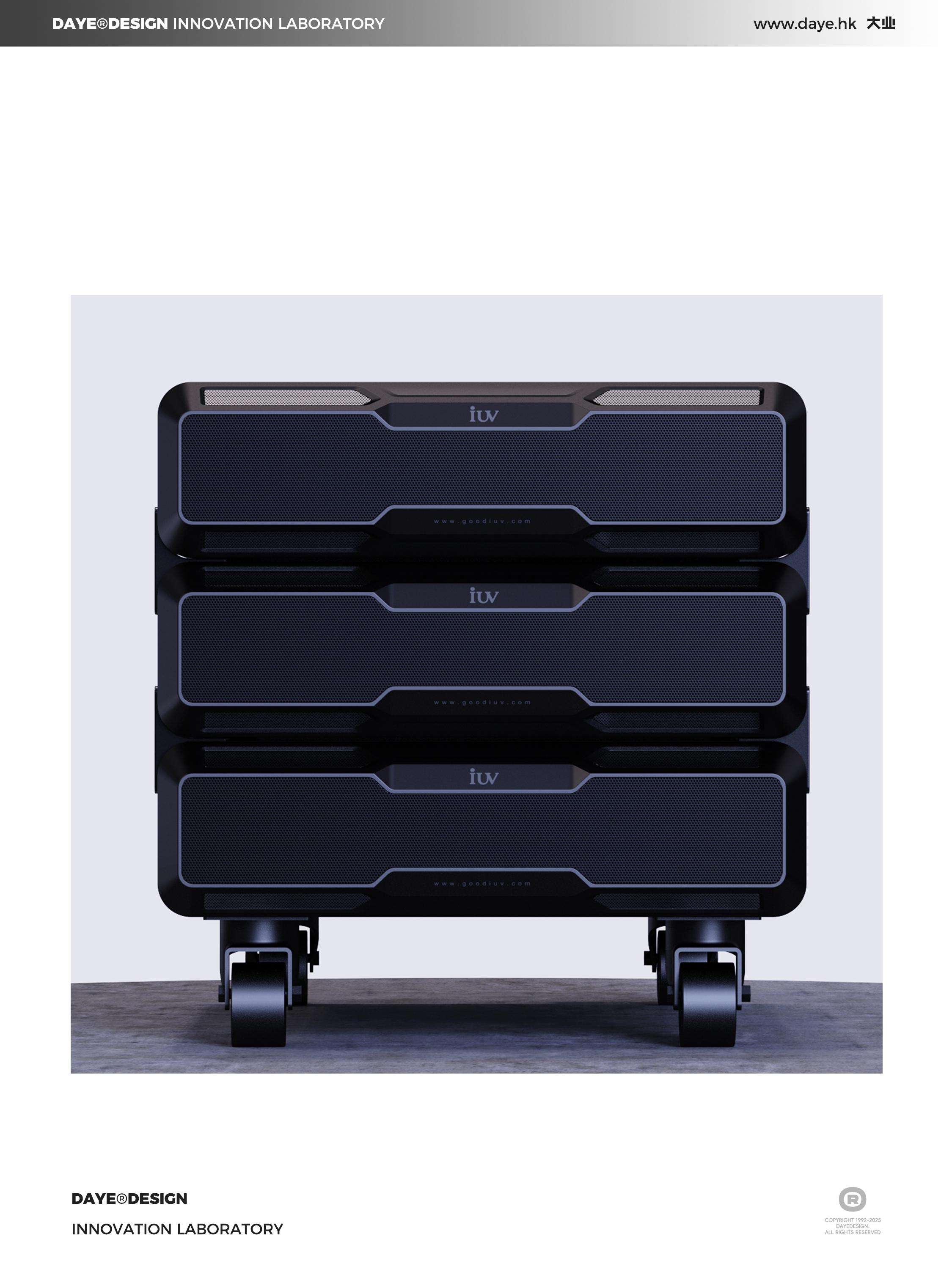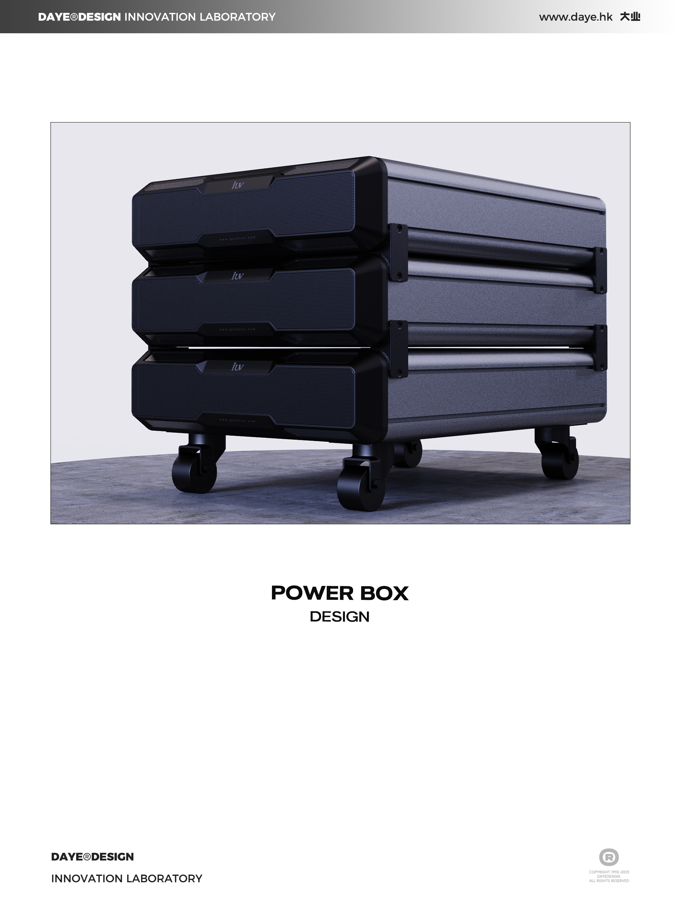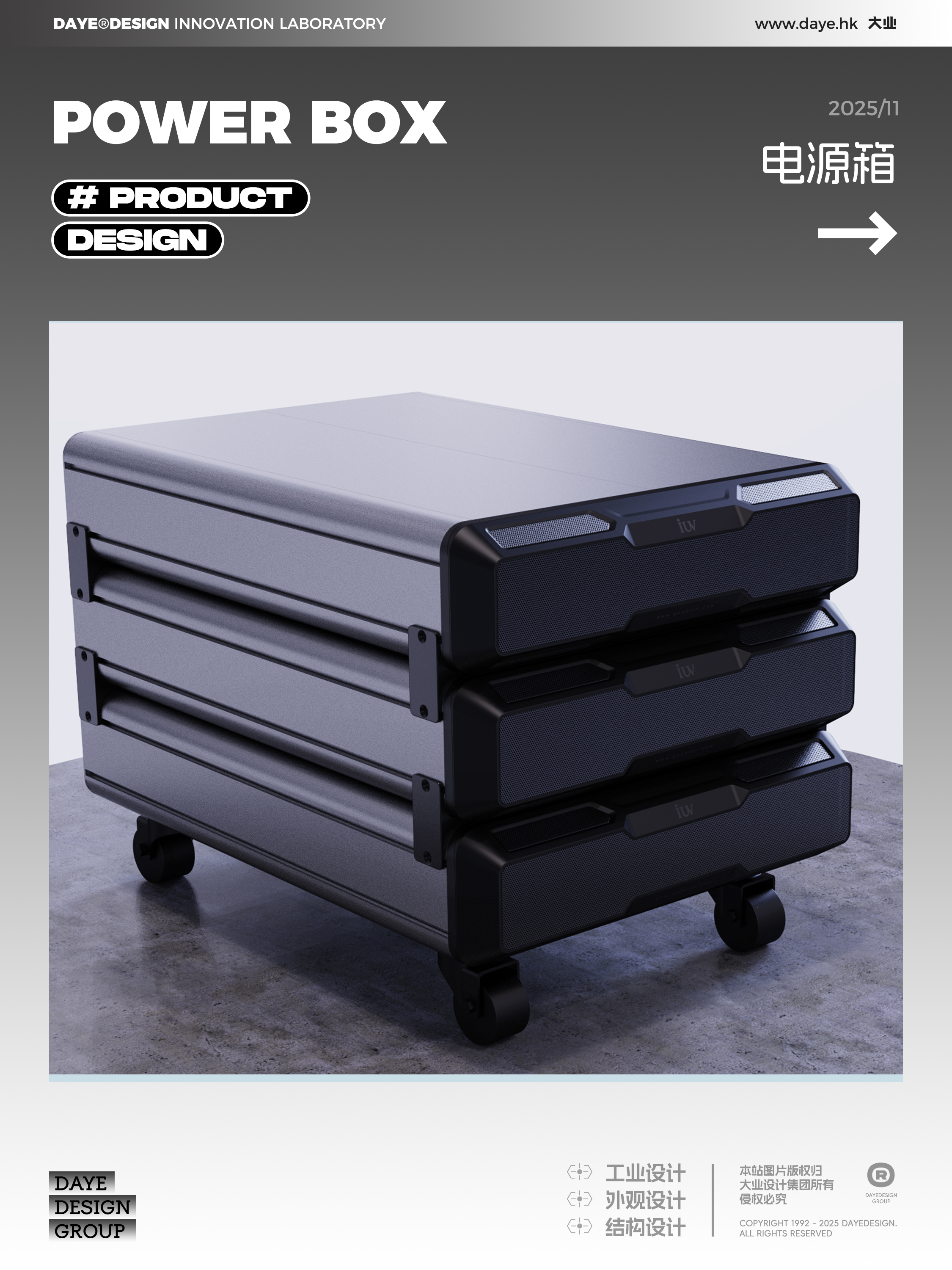 整体遵循扁平化堆叠的工业造型,多层级的箱体设计既满足了电源设备 “模块化供电” 的功能需求,又通过整齐堆叠的形态语言传递出工业设备的秩序感。底部的滚轮设计则强化了 “移动作业” 的属性,让电源箱能灵活适配不同场景的供电需求,从 “固定设备” 升级为 “移动供电单元”。