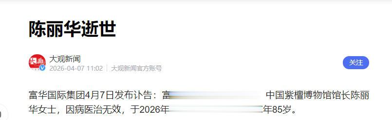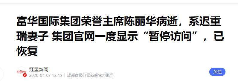 富华国际集团荣誉主席陈丽华病逝,系迟重瑞妻子 集团官网一度显示“暂停访问”,已恢复 红星新闻 2026-04-07 12:45 成都商报红星新闻官方账号