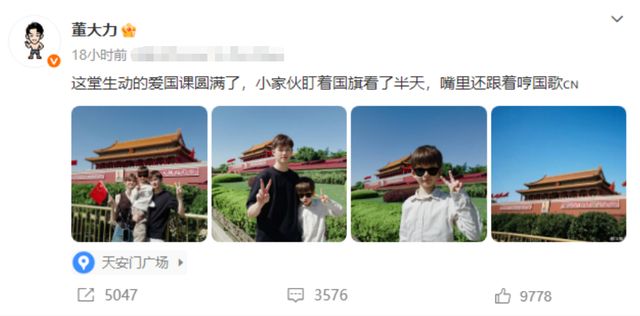 他晒出了四张他和家人的游玩照,并发文:“这堂生动的爱国课圆满了,小家伙盯着国旗看了半天,嘴里还跟着哼国歌CN”。