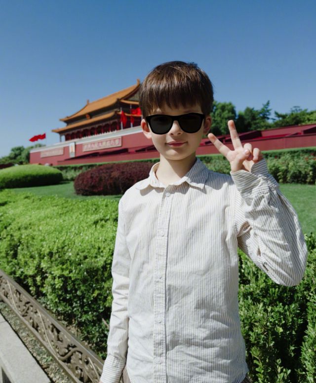 可能是因为太阳太大,保护孩子的眼睛,又或者是为了保护孩子的隐私,董力的混血儿子戴着一副黑色墨镜出镜。