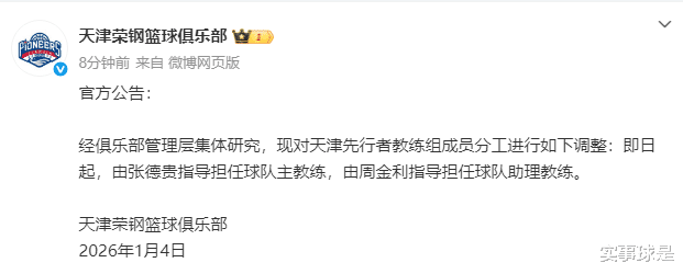 之所以说再次,是因为此前在2025年12月25日,天津先行者官方发布过一次公告,称主教练周金利指导因家中有事务需要处理,在12月26日CBA第6轮南京天之蓝对阵天津先行者的比赛中,张德贵指导将临时代理主教练职务,指挥比赛。