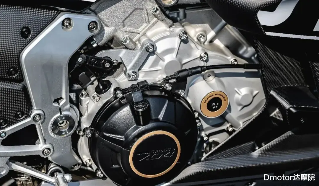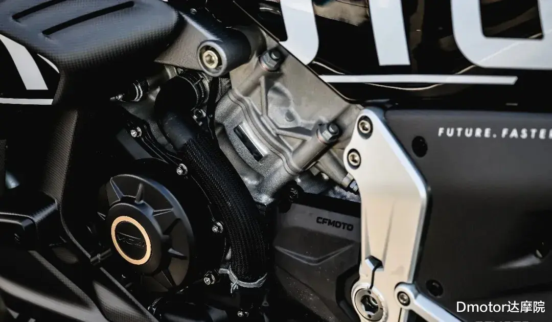 发动机则由春风动力自研并且采用90° V型结构,并导入了MotoGP下放的反向曲轴技术。通过中间齿轮让曲轴反向旋转从而有效抵消高速行驶时的陀螺效应,使车辆在高速弯中更轻盈、更易切入,并且减少前轮抬头与轮胎震动。