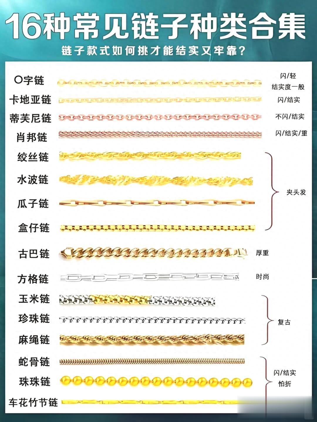 从那种温柔似水的珍珠链,到特别硬核的古巴链,这16种经典的链型,就跟人似的,各有各的个性。