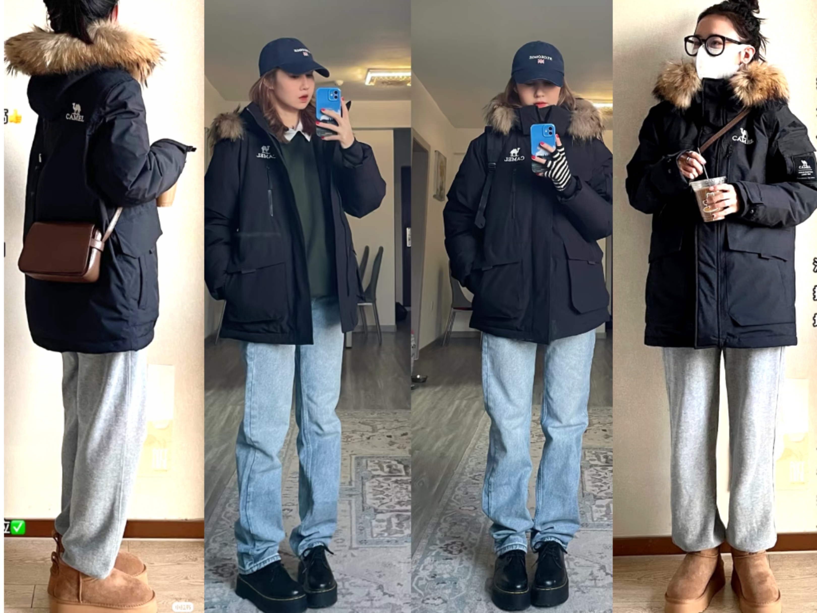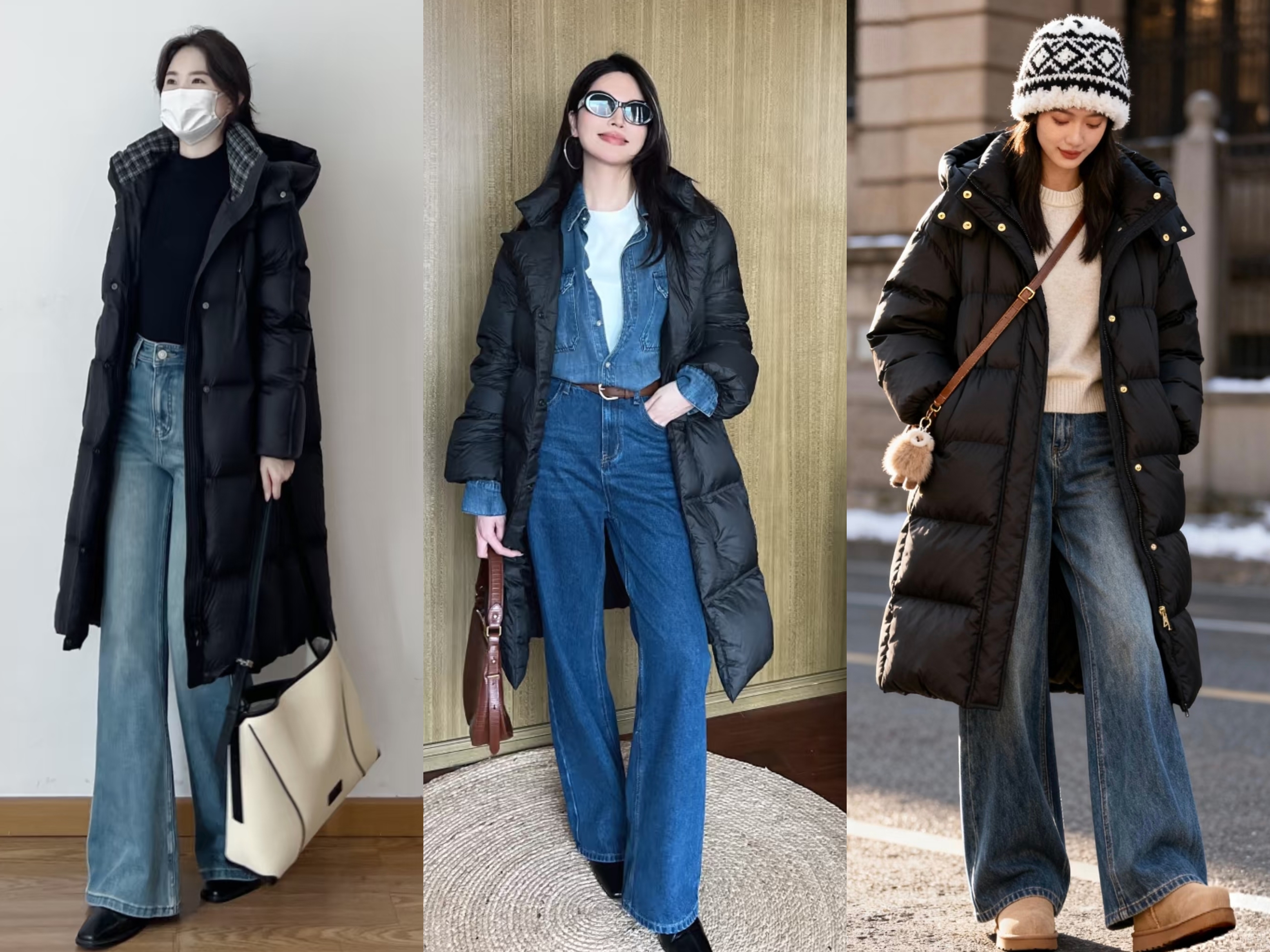第三组:中长款羽绒服+直筒裤+平底鞋/短靴