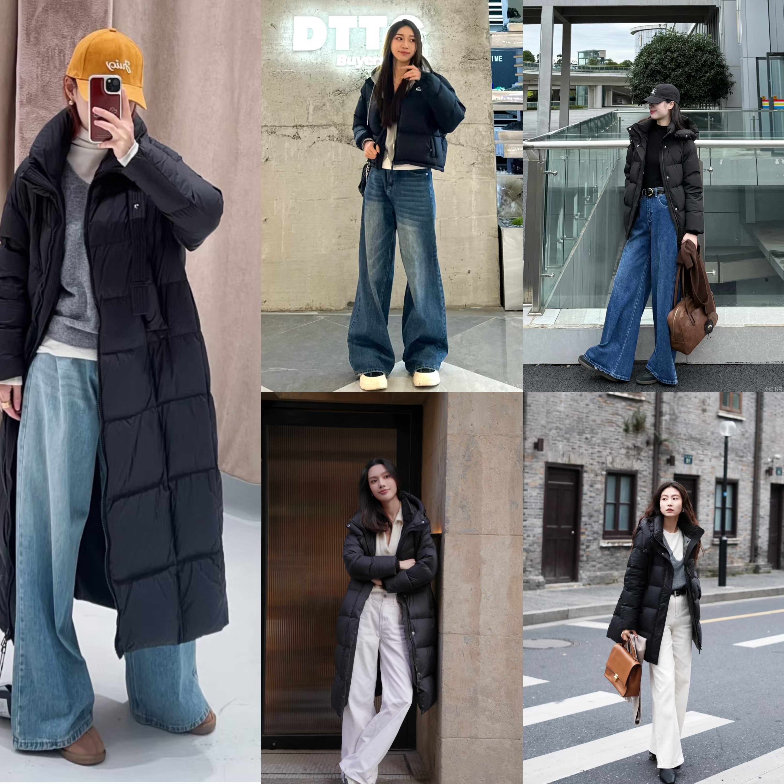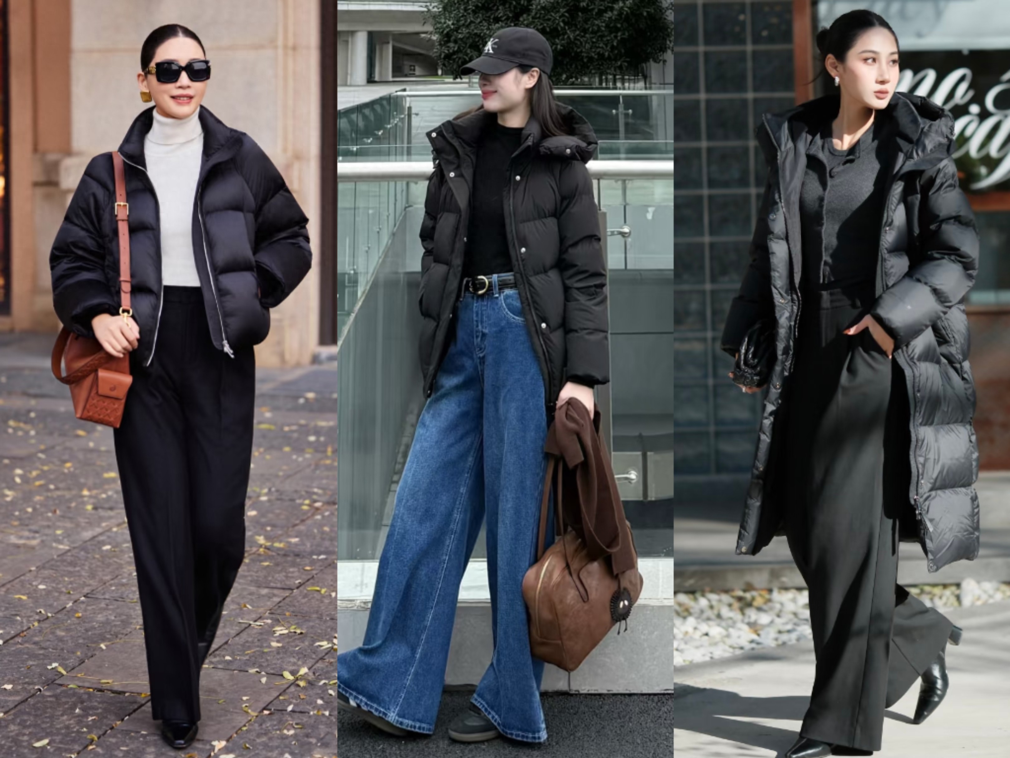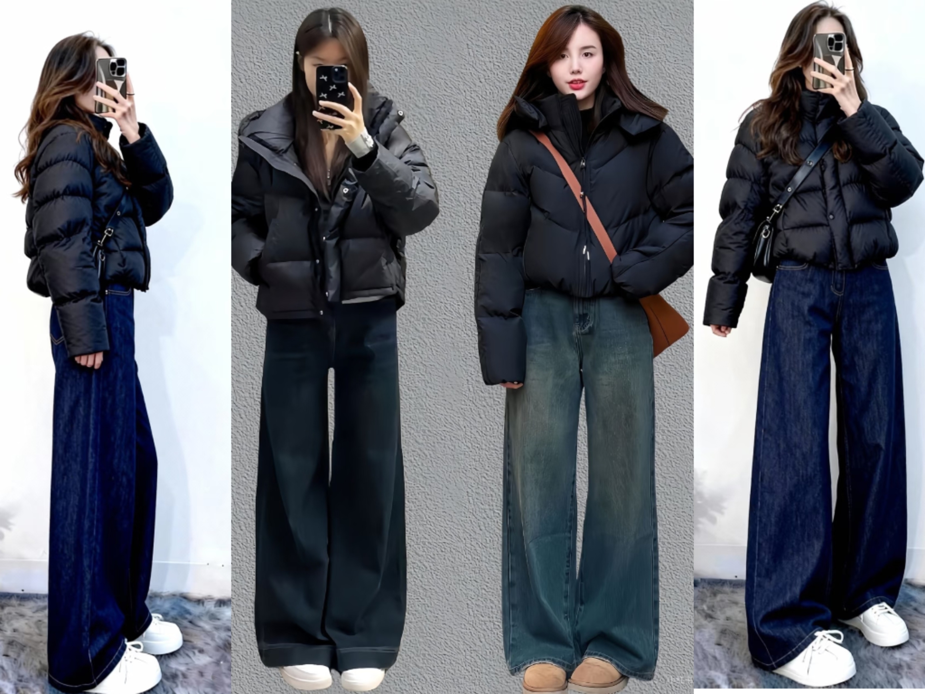 第一组:黑色短羽绒服+高腰阔腿裤+厚底鞋
