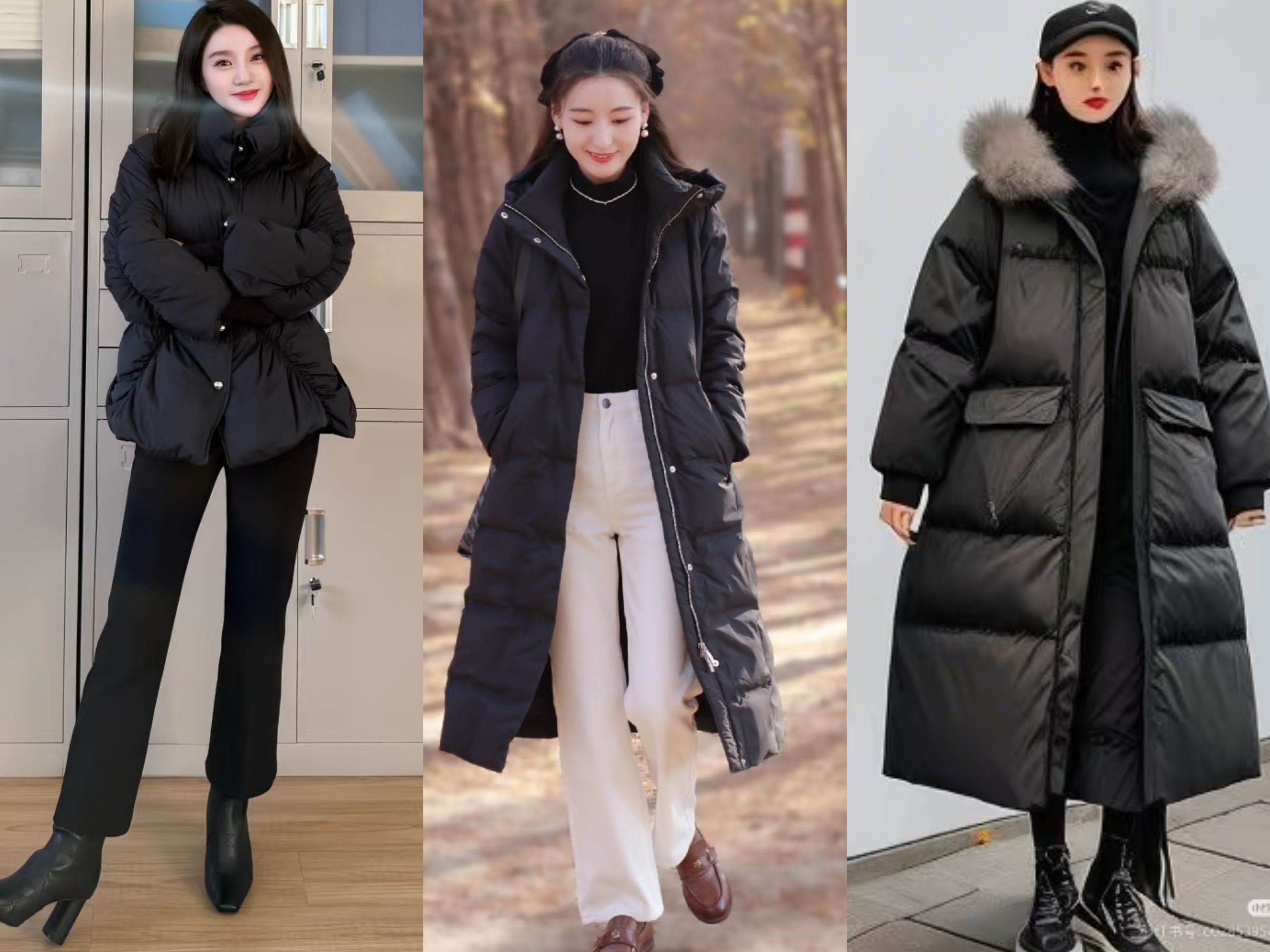 小个子姐妹,避免选择款式过长或过宽的黑色长羽绒服,不仅显臃肿还压个子,整个人看上去更矮。建议选择中款或中长款黑色羽绒服,利落显高。