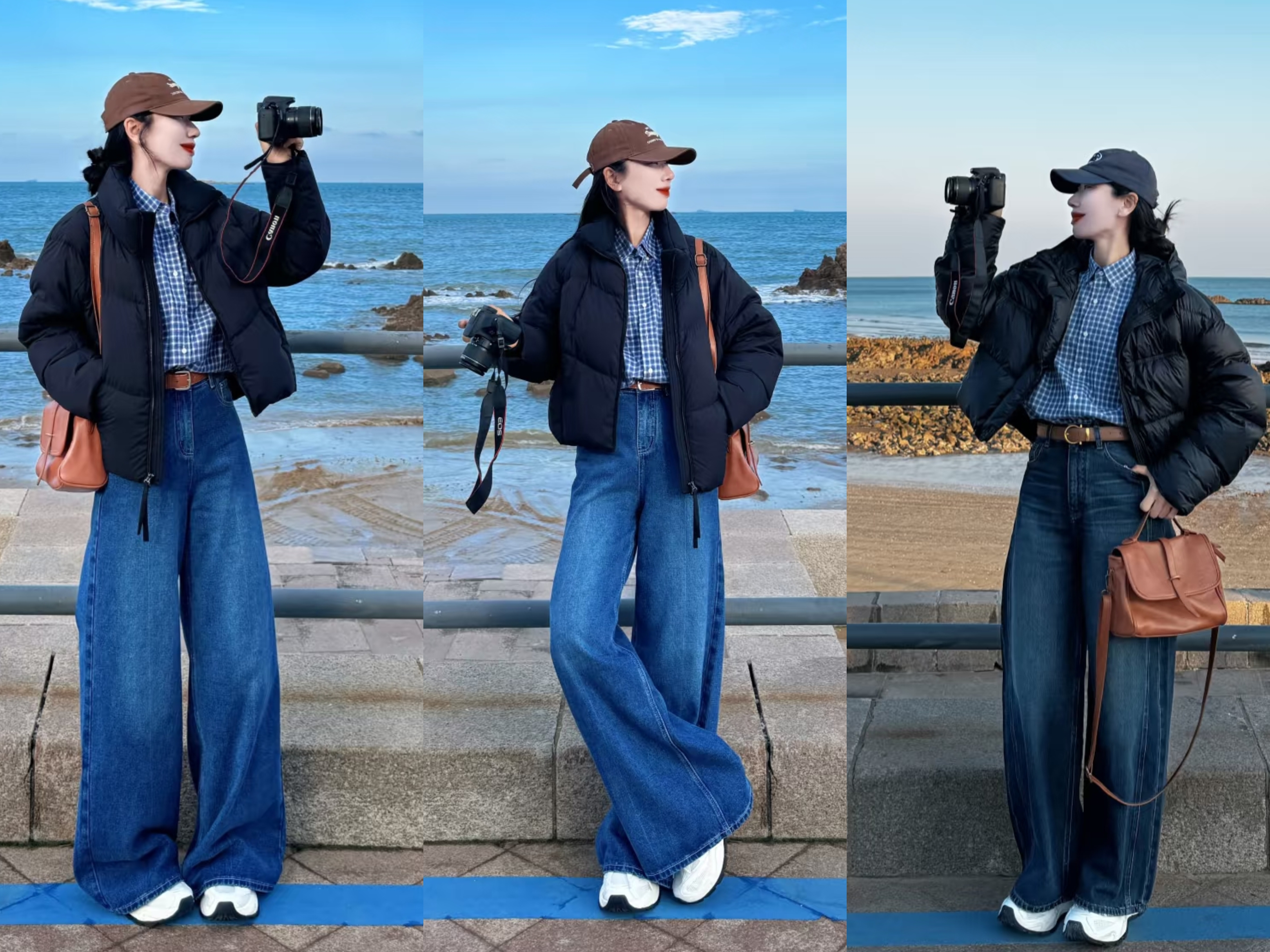 下装选择阔腿牛仔裤搭配,裤子高腰设计,可以和短款羽绒服底摆无缝衔接,不会凉着肚子,还能把腰腹和胯宽腿粗缺陷完美遮住。厚底老爹鞋很好平衡阔腿裤的量感,造型休闲舒适又保暖。