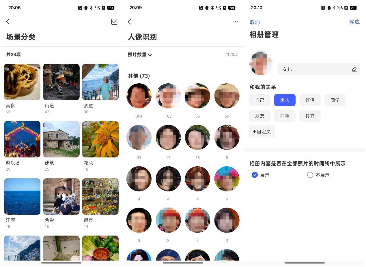极相册是极空间NAS产品中最常用的功能,以前的极相册可以按时间、场景和地点来分类,现在有了更新的AI技术,极相册的功能也大大拓展了。它能自动识别照片,按人物聚合个人相册,可以手动标记人物关系、设定封面、隐藏人物、校正相册和合并相册等管理模式。支持通过AI引擎对视频进行分析,按人物把视频分类。还能识别出照片中的物体、美食、动物、旅游风景和运动等数十种的场景,并进行分类。并且,它也能像手机一样精选出每天拍的精彩照片,并推荐展示出来。