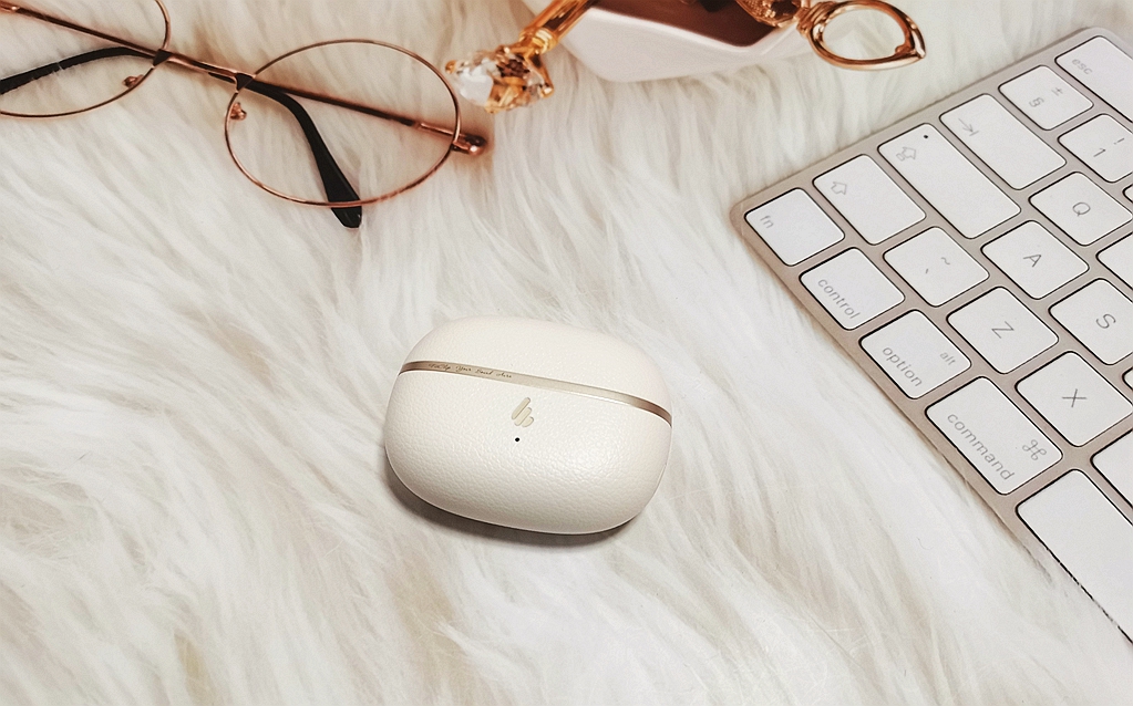 漫步者FitClip Ultra耳夹式蓝牙耳机的充电仓采用了椭圆形鹅卵石造型设计,而且皮纹质感非常舒服,也便于用户收纳和携带。充电仓的周圈有一条细细的金色腰线,还印着漫步者的小Logo。此外,Type-C充电接口被设计在了充电仓的正面底部,这样就不会影响耳机整体的外观美感。