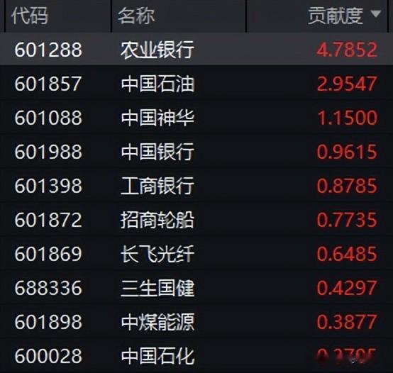 农业银行今天涨超3%对指数贡献度居首。