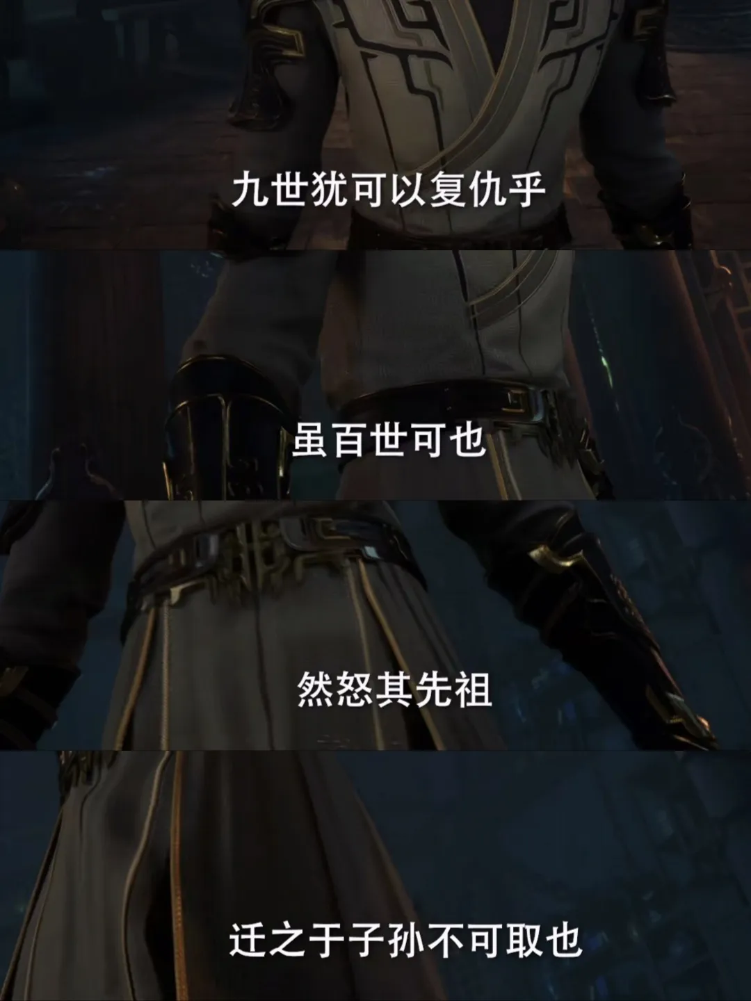 叶凡台词“九世犹可以复仇乎?虽百世可也。”出自《春秋公羊传》,这一句的意思也非常浅显易懂,就是“已过九世还可以报仇吗?即使是过了百世也可以报仇。”
