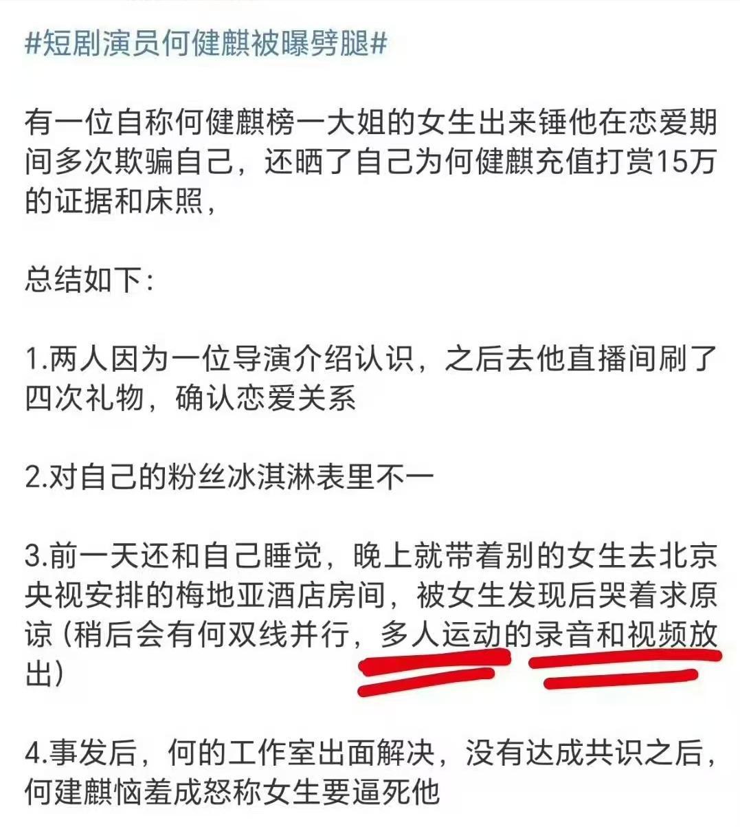 此次事件的导火索,是一位自称是何健麒“榜一大姐”的网友爆料。该网友称,自己在与何健麒交往期间,发现其多次劈腿,甚至在春节期间偷偷前往泰国与其他女性约会。爆料内容还包括大量的聊天记录和照片,尺度之大令人咋舌。这些证据的曝光,无疑将何健麒推向了舆论的风口浪尖。
