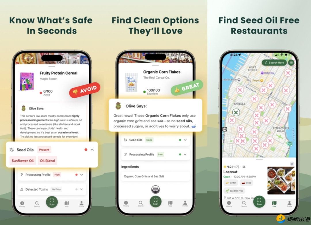 相比之下,「Olive」延续了“食品透明化”这一核心逻辑,但在落地美国后进行了明显的本土化改造。团队捕捉到美国健康消费文化中的新趋势——“无籽油饮食”,并围绕这一理念推出了差异化功能。「Olive」不仅能扫描包装食品,还能检索附近使用无籽油(seed oil free)烹饪的餐厅,让用户将健康判断延伸到外出用餐场景。