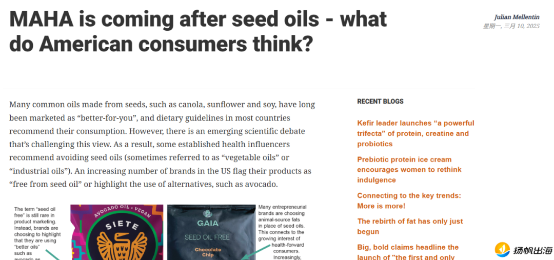 所谓“籽油”,即从植物种子中提取的高油脂植物油,包括大豆油、菜籽油、玉米油等。近年来,美国健康论坛中兴起的“无籽油”风潮,源于人们对工业精炼油可能引发炎症与代谢问题的担忧。部分健康博主与营养顾问将“无籽油”与“抗炎”等理念绑定,使“无籽油饮食”逐渐成为美国年轻人新的健康消费标签。