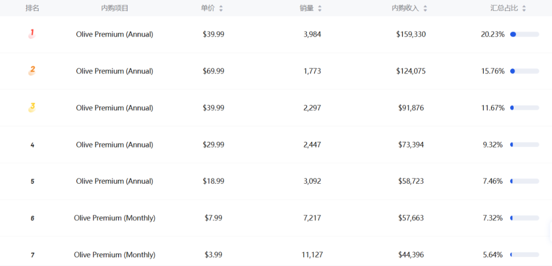 「Olive」上线以来的内购销量、占比,来源:点点数据