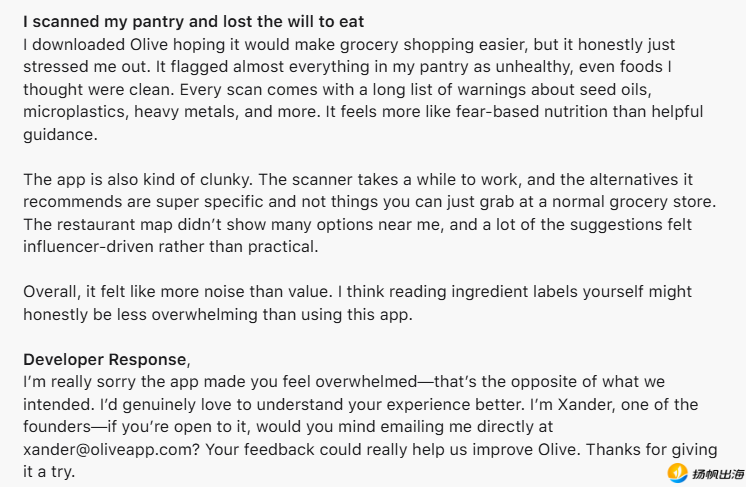 在产品的使用过程中,一些用户也表达了不同的声音。有用户反馈称,「Olive」在检测后将自己几乎所有囤货标记为“不健康”,甚至包括原本被认为干净的食品,“这感觉更像是一种基于恐惧的营养信息,而不是实用的指导。”