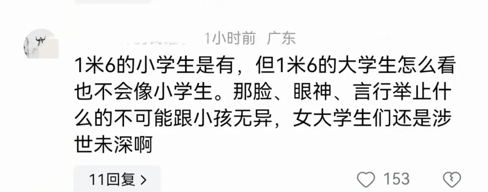 还有网友称:1米6的个子的大学生,怎么看都不可能像小学生呀!看看这些女大学生涉世未深呀!