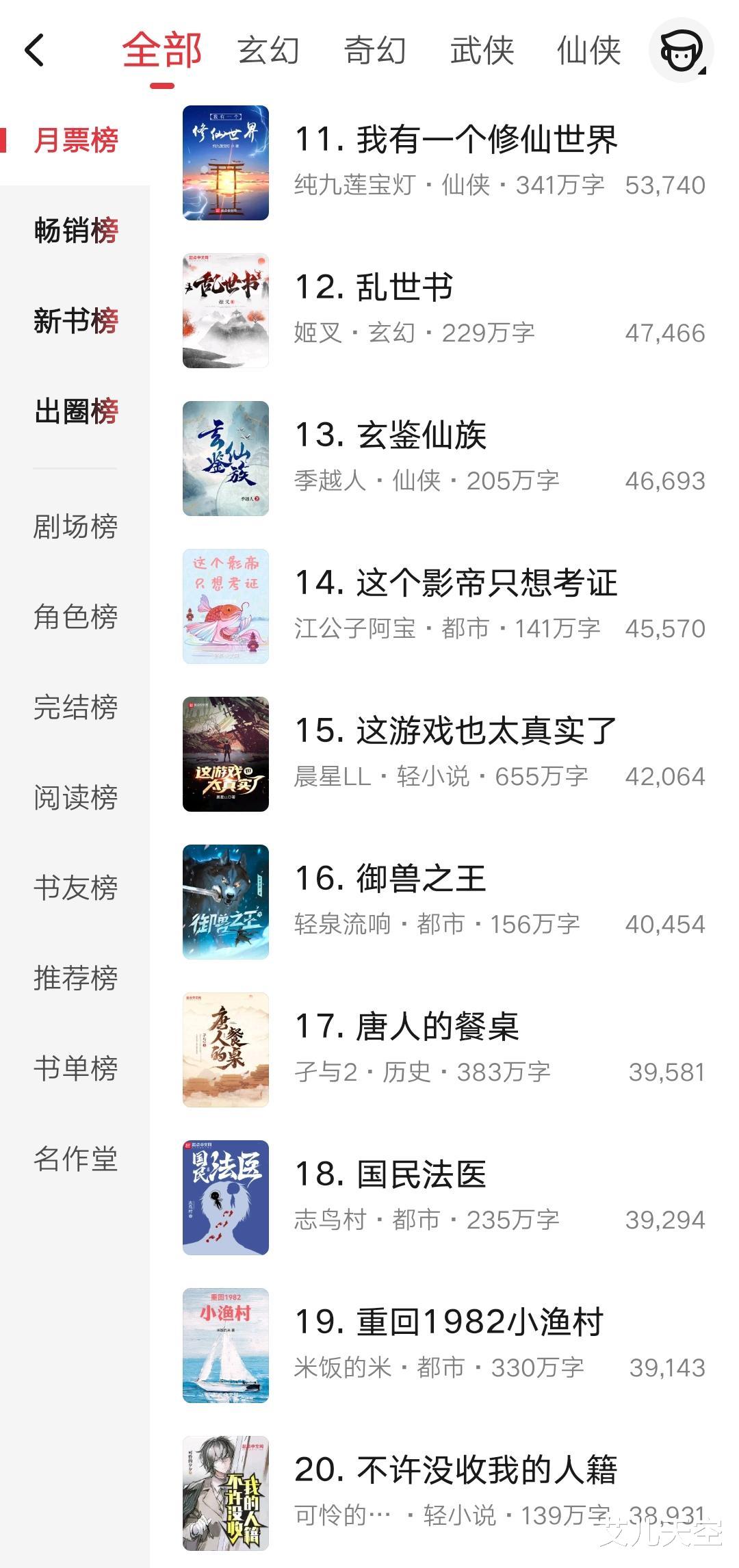 季越人的《玄鉴仙族》和江公子阿宝的《这个影帝只想考证》互换了位置,前者十八号的时候均订破了四万,这周也放弃了去年会,专心打磨剧情,后者也是创造了自己的最好成绩了。