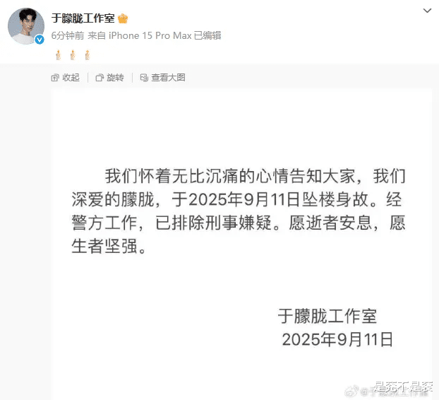 2025年9月,演员于某某坠楼身故的消息如惊雷般撕裂网络——公众为年轻生命的骤然消逝陷入哀恸,家属、朋友以及粉丝在悲剧中承受着锥心之痛。