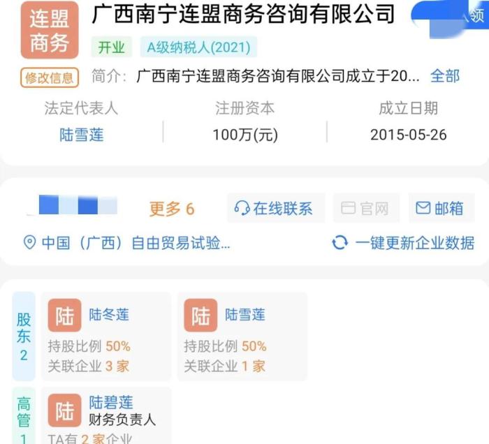 现在是慧泊公司财务负责人,她还是广西南宁连盟商务咨询有限公司财务负责人。而这家公司的股东是陆冬莲和陆雪莲。这应该就是三姐妹开的公司。