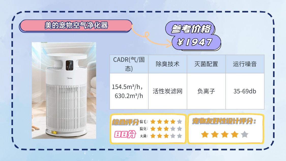 美的采用白色圆柱形设计,整体简洁利落,适合放置在卧室或客厅场景。机身配有 LED 控制屏,支持智能 APP 联网,能够实时检测空气质量,并根据环境变动自动切换净化模式。滤芯整合高密度 HEPA 与活性炭组合,能够高效过滤空气中的毛发、皮屑和异味,提高整体空气清洁度,契合养宠家庭的基础净化需求。机器工作时稍有一点噪音,适合对噪音要求不高的家庭使用。