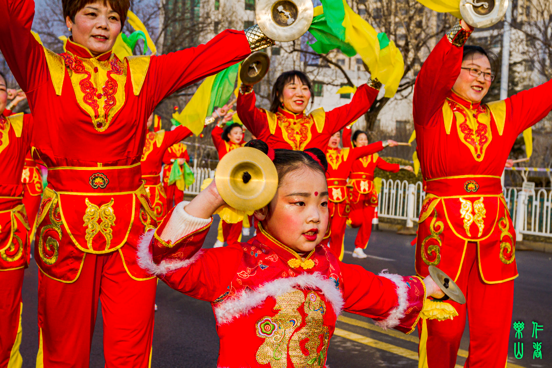 再看这个年龄不过五六岁,身高不足一米的小娃儿,一身红福绸缎小汉服,扎着双纽“朝天髻”,手持一双最小最小的小铜钹,身手矫健,一招一式都是辣么的欢快灵动、拍手叫绝。新时代沂蒙山后起之秀的精气神,展现的活灵活现、栩栩如生……且一直跟随大人们的舞蹈队节奏精准、从不掉队!俺给她拍摄的片片美其名曰:“自古英雄出少年!”