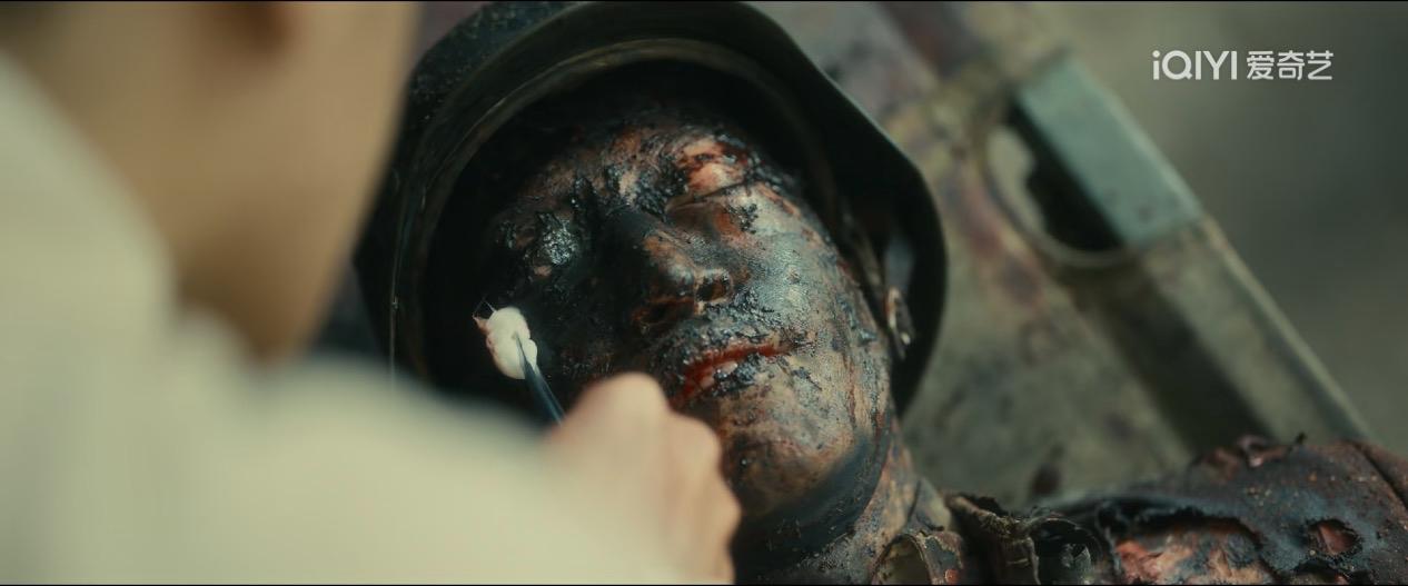 王阳在剧中饰演旅长张云魁,满脸血污、肩头鲜红的血迹,再加上战场上被炸得伤痕累累的脸,那种战损的真实感,让人看了触目惊心。