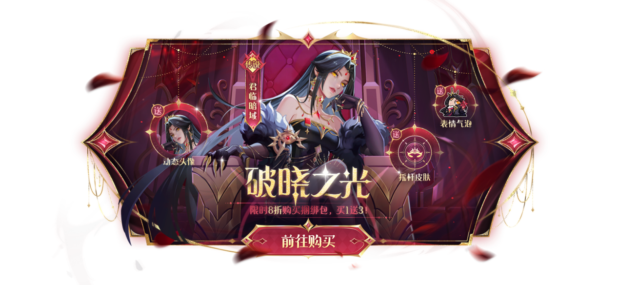 游戏还推出了女帝首款身份皮肤「君临暗域」,为玩家提供更多个性化选择。即日起,限时8折购买捆绑包,动态头像、摇杆皮肤、表情气泡,全部解锁,体验气场全开的豪华传说皮肤!